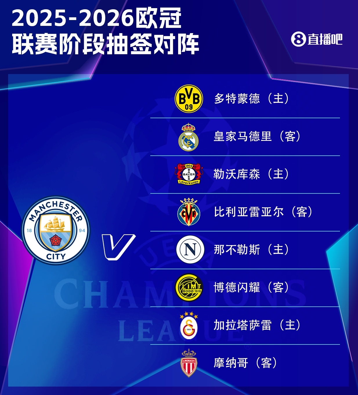 08月30日讯 欧足联官方公布欧冠职业联赛 阶段赛程,曼城赛程如下。