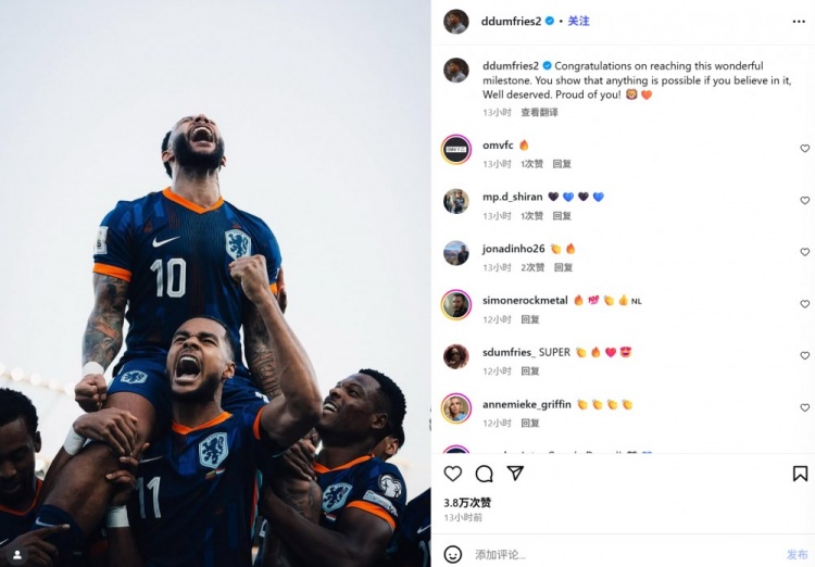 邓弗里斯也在赛后通过社媒晒出了德佩的庆祝照,24直播网并配文:“祝贺达成这一非凡的里程碑。你证明了,只要坚信自己,一切皆有可能。这是你应得的AC米兰队最新消息今天,为你感到骄傲!🦁🧡”