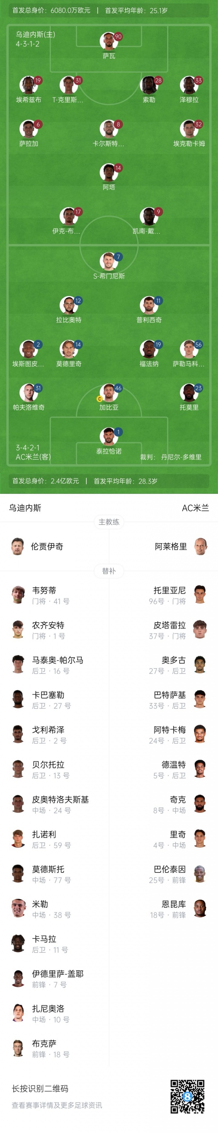 乌迪内斯后备 :41-维努蒂、1-农齐安特、16-马泰奥-帕尔马、27-卡巴塞勒、2-戈利希泽、13-贝尔托拉、24-皮奥特洛夫斯基、59-扎诺利、77-莫德斯托、38-米勒、11-卡马拉、7-伊德里萨-盖耶、10-扎尼奥洛、18-布克萨