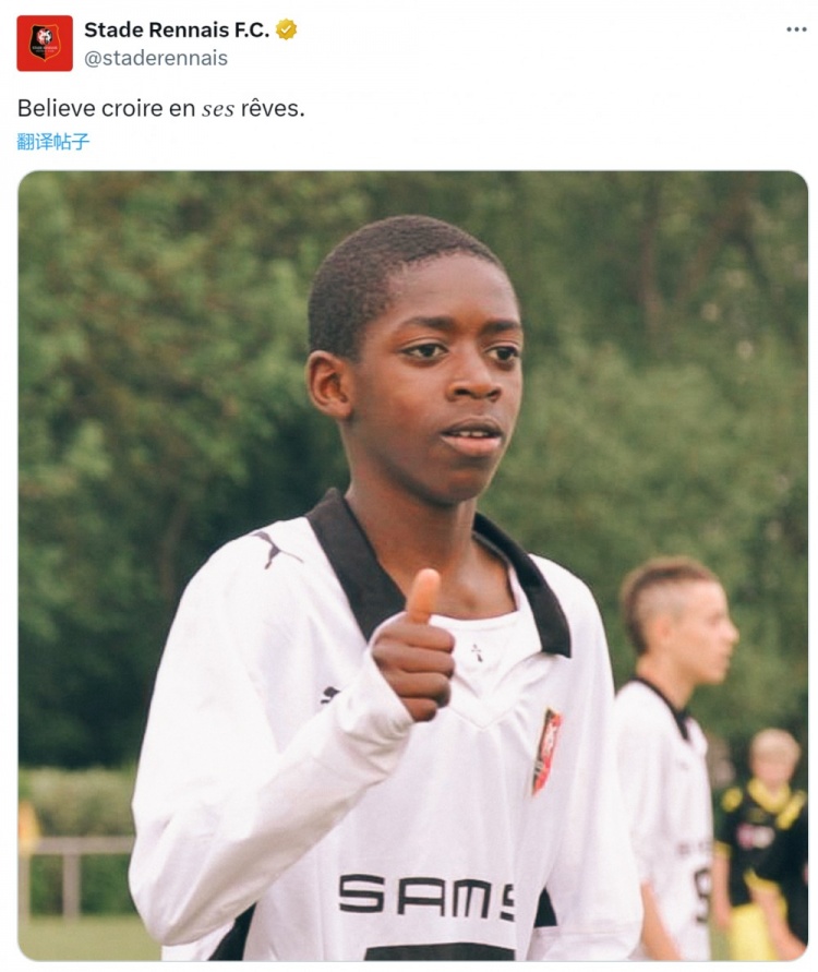 雷恩社媒晒出登贝莱儿时在俱乐部的照片,英超免费在线高清直播配文:“相信自己的理想 。”