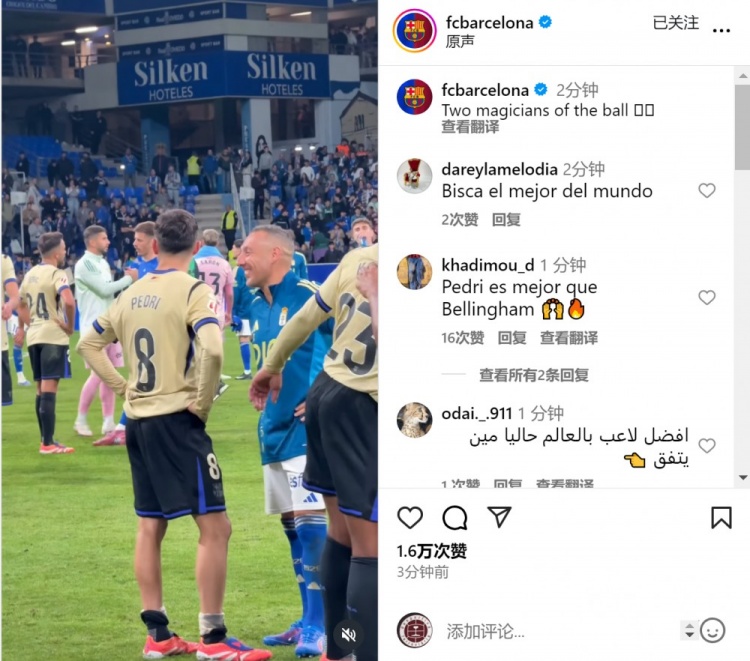 巴萨中场球员佩德里赛后与皇家奥维耶多40岁中场球员卡索拉沟通 ,英超免费在线高清直播巴萨官方社媒晒出视频,配文:“两位运动活动 场 魔术师。”
