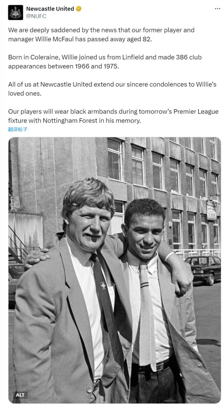 纽卡全体成员向威利的亲友致以诚挚慰问。为纪念威利,球员们将在明日对阵诺丁汉森林的英超赛事 中佩戴黑色臂章。”