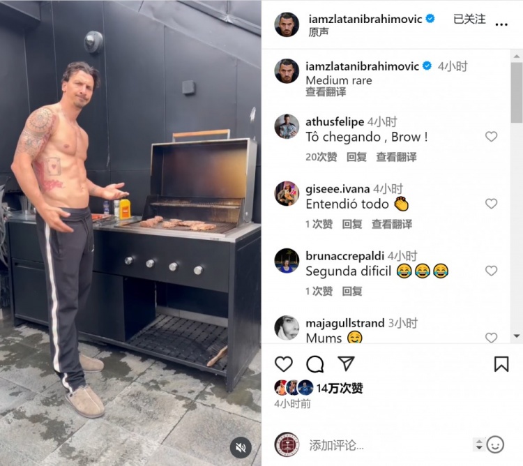 肌群 线条依然明显!44岁伊布晒赤裸上身烤肉视频:五分熟