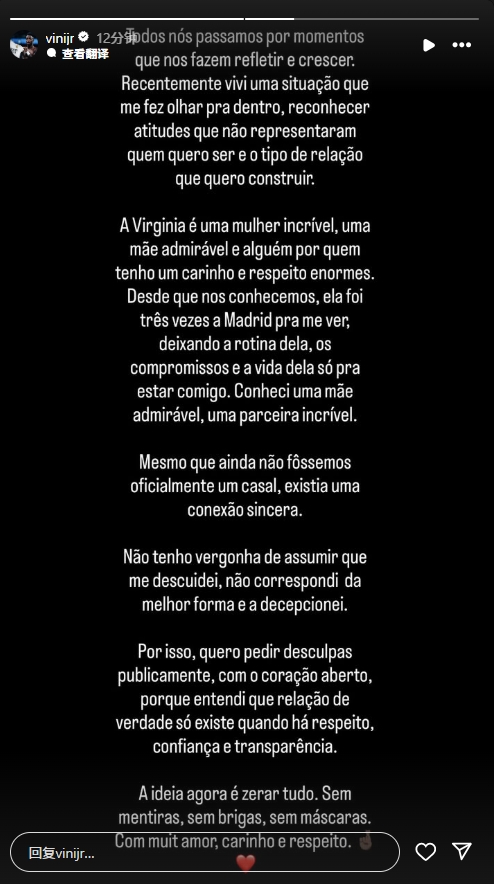 今日维尼修斯发布长文向弗吉尼亚致歉:
