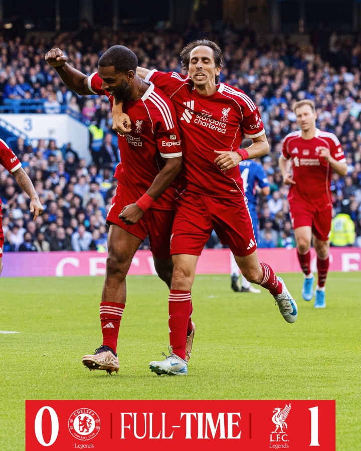 10月12日讯 利物浦传奇队在客场应战 1-0击败了切尔西传奇队,荷兰前国脚巴贝尔打入制胜球,得分 后他用模仿若塔庆祝动作的方式向他致敬。