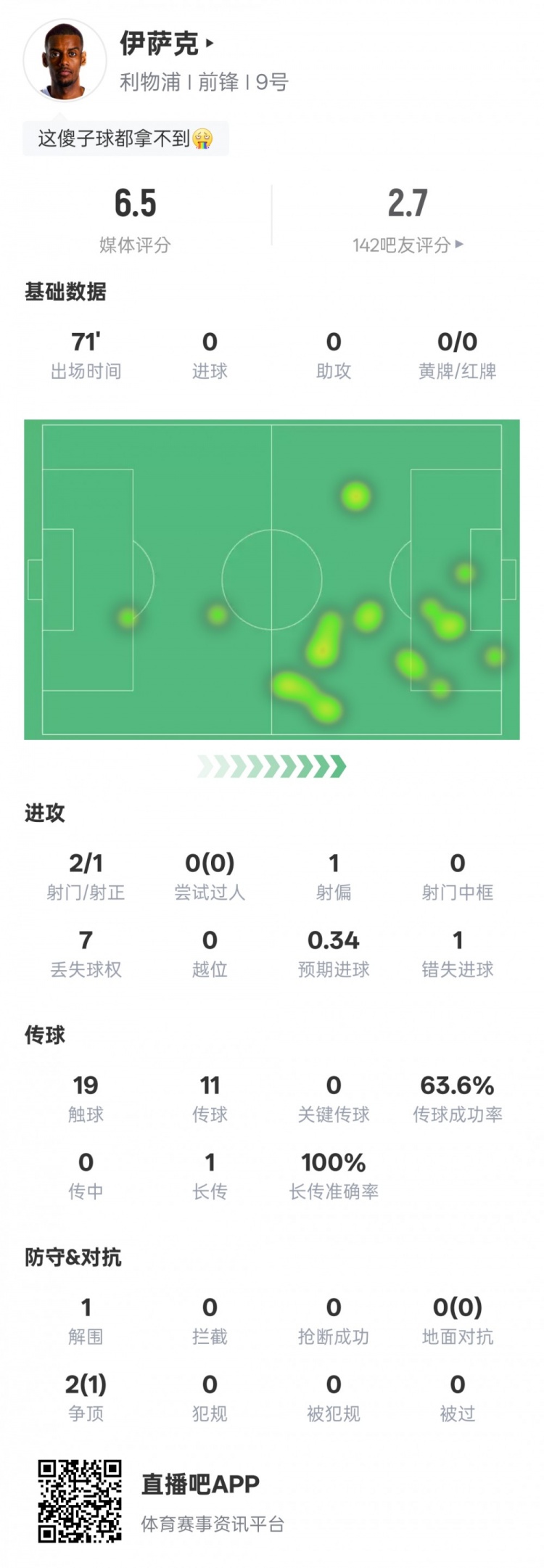 10月20日讯 2025-26赛季英超职业联赛 第8轮重头戏,利物浦主场作战 迎战曼联,伊萨克杆位出战,英超免费在线高清直播2射球 1射正,1次错失得分 机会,评分6.5。