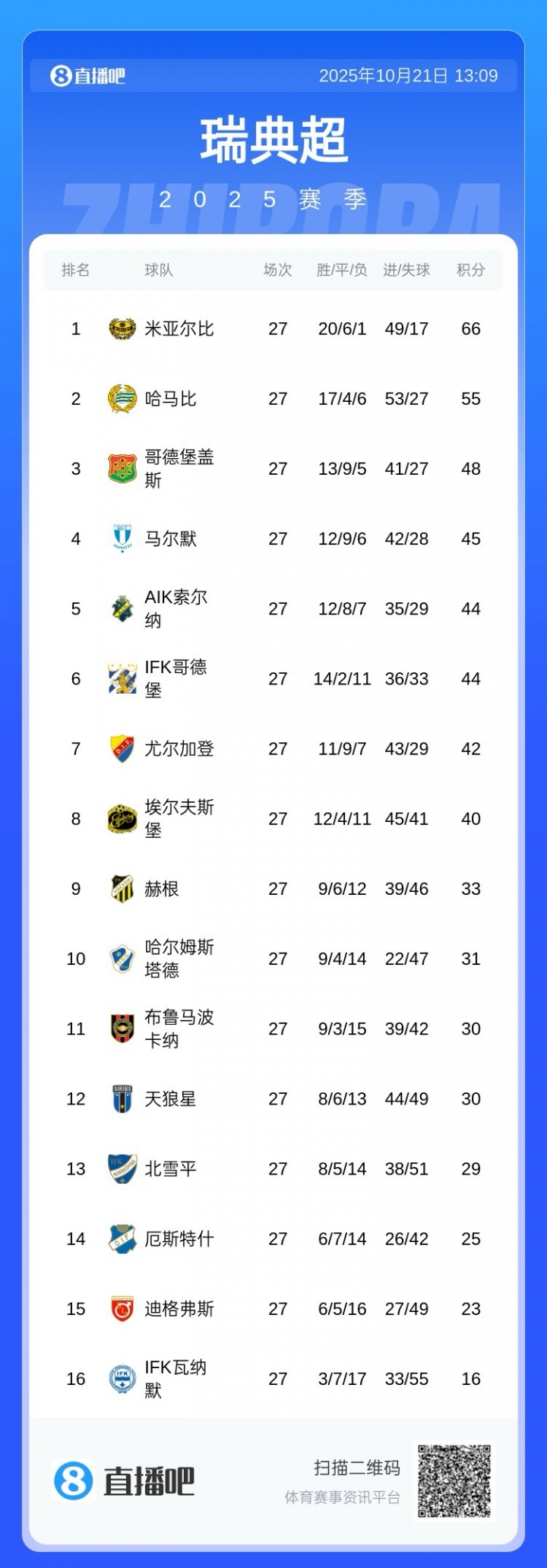 2025年,在连续五个赛季排在瑞典顶级职业联赛 前十之后,本赛季米亚尔比夺魁 !下赛季将参加欧冠附加赛