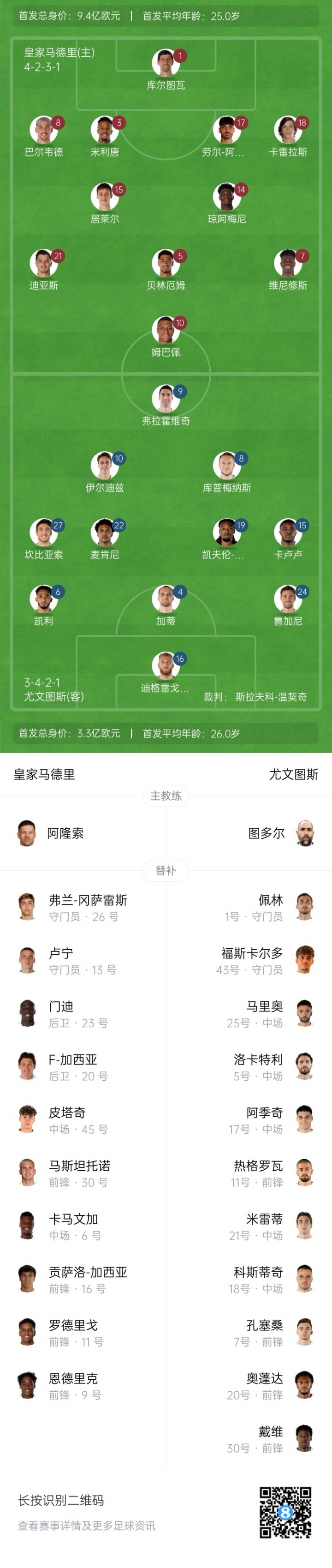 皇马杆位:1-库尔图瓦、17-劳尔·阿森西奥、8-巴尔韦德、3-米利唐、18-卡雷拉斯、14-琼阿梅尼、5-贝林厄姆、15-居莱尔、21-迪亚斯、7-维尼修斯、10-姆巴佩