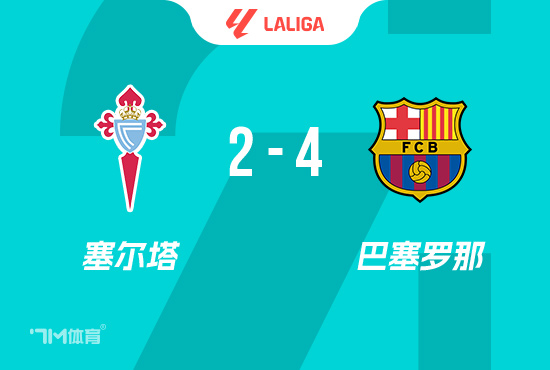 下半场补时6分钟。最终全场赛事 结束,塞尔塔2-4巴萨。