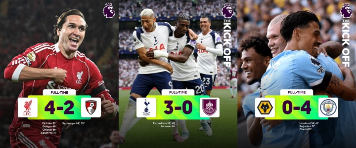 08月18日讯 新赛季英超首轮基本结束,经典 BIG6的赛事 都已经打完,其中利物浦4-2伯恩茅斯、曼城4-0狼队、热刺3-0伯恩利、切尔西0-0水晶宫、阿森纳1-0曼联。