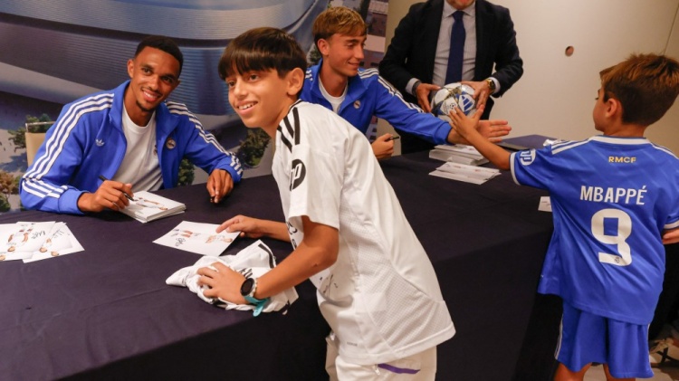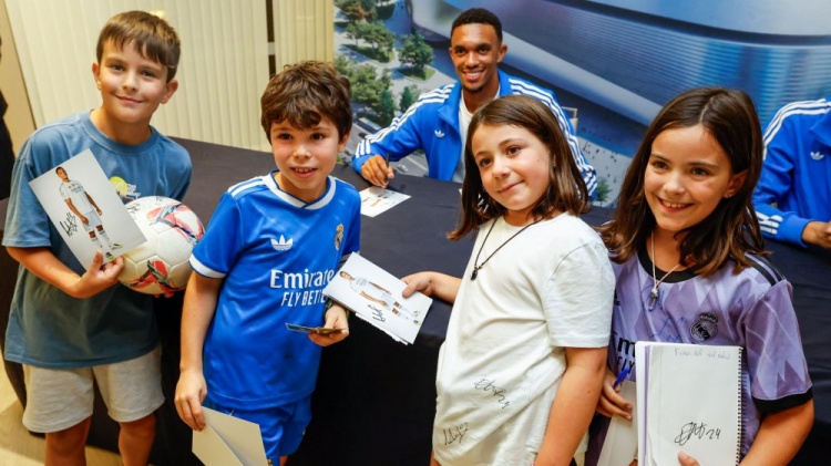 9月13日讯 据西班牙六台报道,皇马后场球员阿诺德和赫伊森为皇马小球迷们签名,英超比赛在线观看无插件并合影留念。
