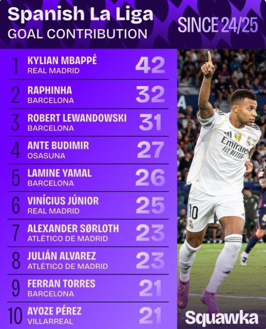 9月25日讯 本赛季,皇马射手姆巴佩延续了良好的竞技状态 ,法国人在西甲中已经打进7球。根据Squawka的数据统计 ,英超比赛在线观看无插件上赛季以来,姆巴佩在西甲直接加入 42球位居榜首。