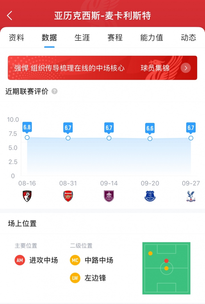 麦卡利斯特本赛季开赛后,表现平平。目前2个月来的英超赛事 以及两场欧冠赛事 没有一场媒体评分达到7分。
