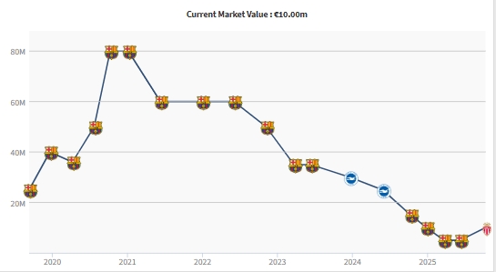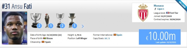 10月10日讯 德转更新了法甲的身价,摩纳哥前场球员法蒂身价从500万欧上涨至1000万欧。