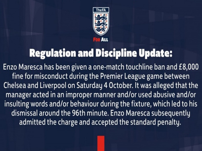 英足总已经发出公告,切尔西面对利物浦的赛事 中,第96分钟,马雷斯卡由于存在不当行为,存在使用侮辱性的言语,主裁判 因此出示驱逐 ,被罚离场。有鉴于此,马雷斯特需要禁赛一场,同时还要缴纳8000英镑的罚款。马雷斯卡已接受了关于事实的指控,愿意接受相应的处罚。