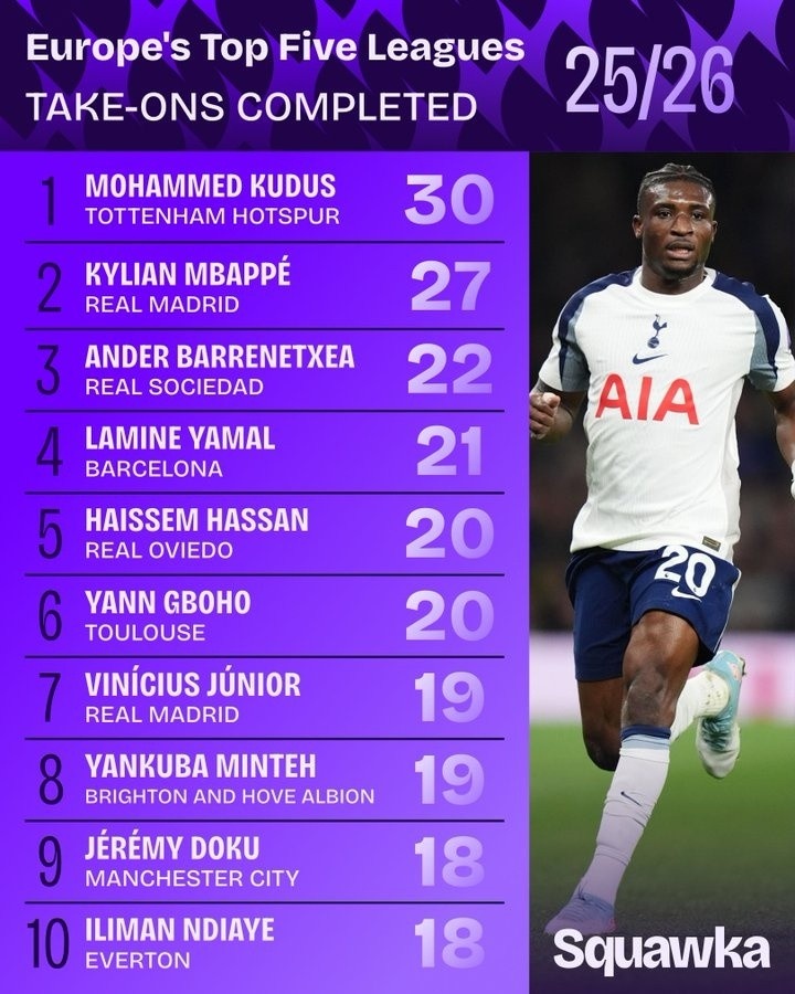 10月17日讯 根据本赛季欧洲五大职业联赛 的数据统计 ,热刺球员库杜斯以30次成功过人领跑该项数据榜,24直播网皇马前场球员姆巴佩以27次紧随其后。