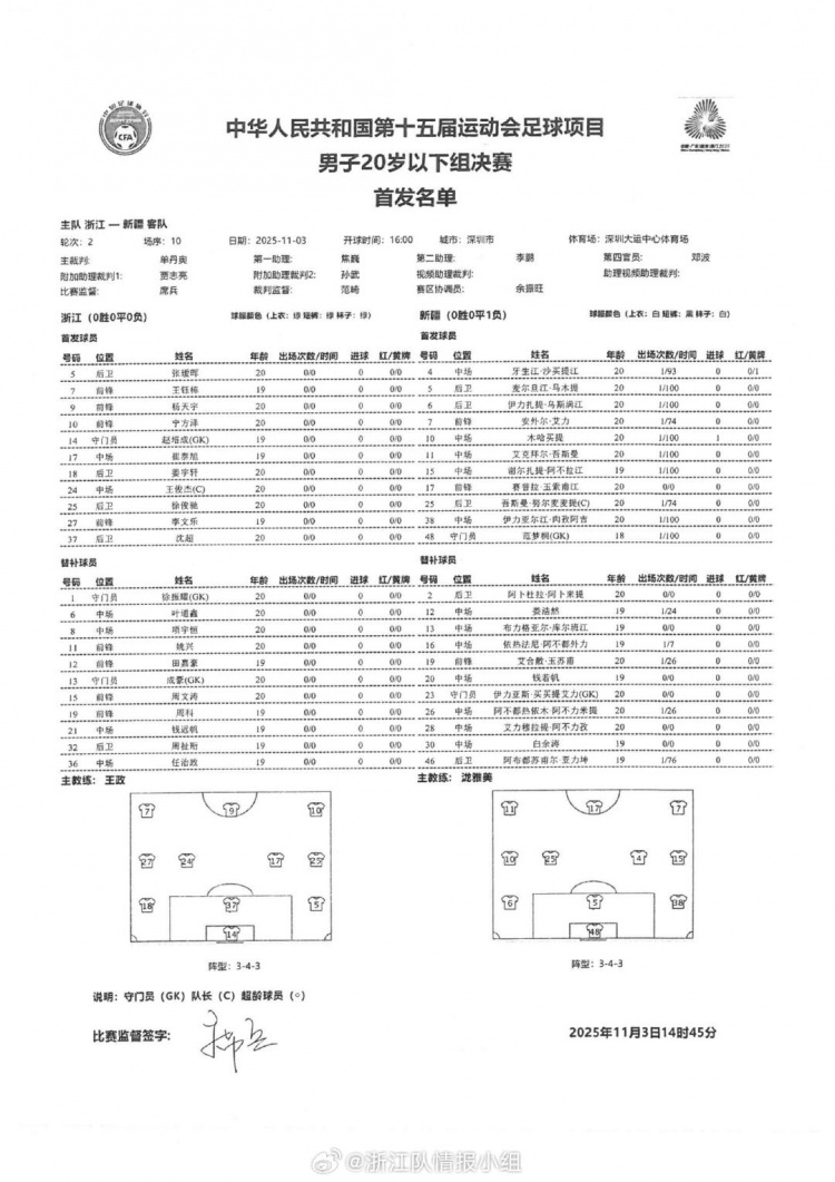 11月3日讯 今天16:00,全运会男足U20组别第二轮,浙江队vs新疆队赛事 在深圳大运中心运动场 展开,赛前双方杆位公布,英超直播王钰栋、张瑷晖出战。首轮赛事 ,新疆队不敌山东队,浙江队轮空。