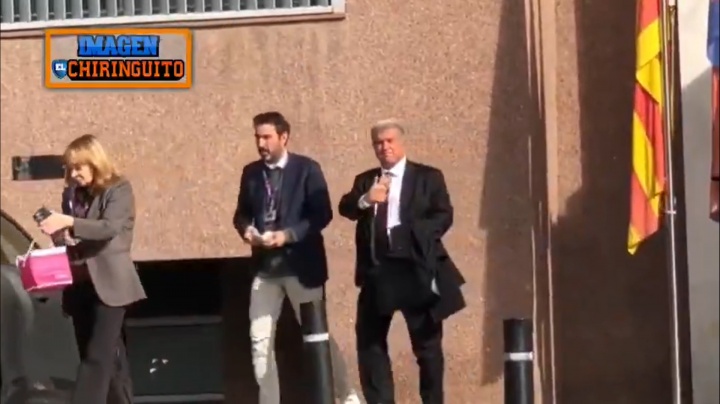 西班牙六台记者发布的一段视频显示,英超直播多位记者朝拉波尔塔喊话提问如何看待梅西此次参观诺坎普一事,拉波尔塔朝镜头竖了个大拇指,没有驻足回应。