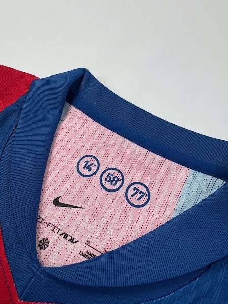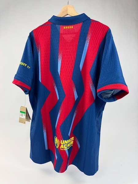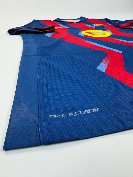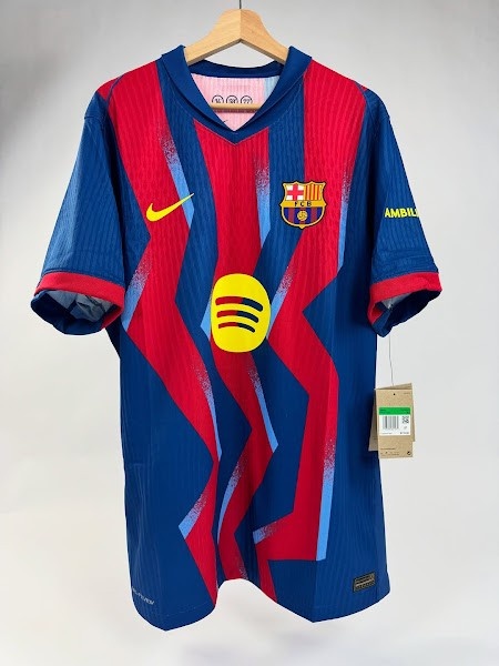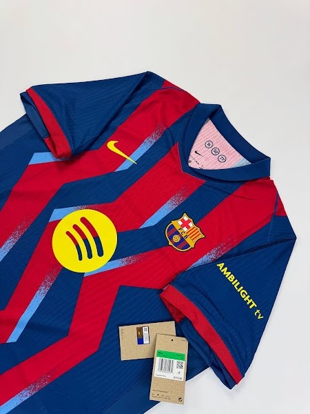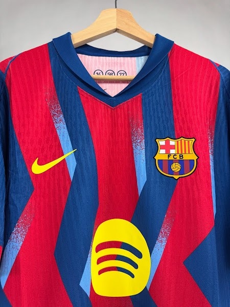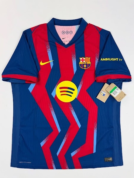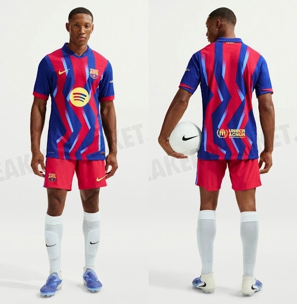 与20年前的经典蓝红条纹不同,巴塞罗那2025-26赛季第四运动活动 服 采用了蓝色和红色的锯齿形条纹,并带有浅蓝色的图形元素。