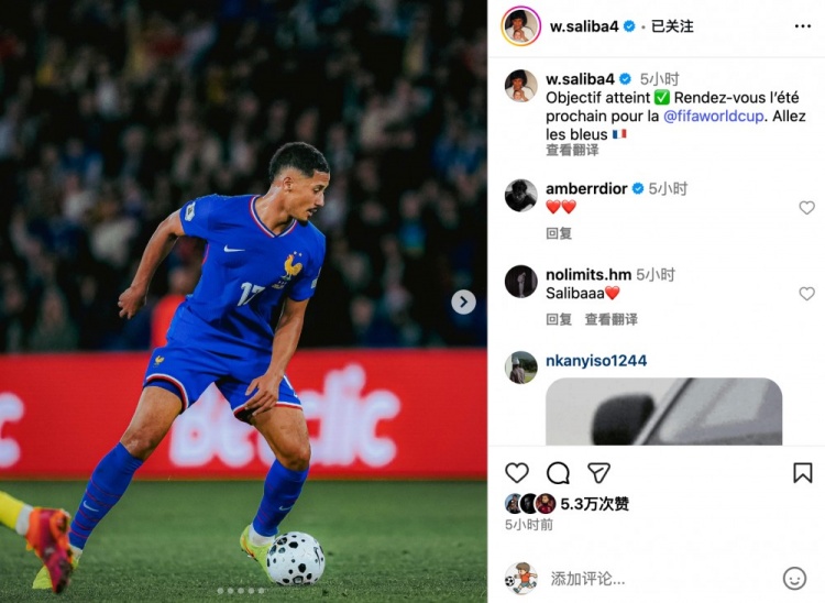 赛后,法国后场球员萨利巴更新社媒晒照庆祝晋级下一轮 世界杯赛 英超在线直播免费观看直播高清完整版,英超比赛在线观看无插件写道:目标达成✅明年夏天世界杯赛 见。助威 ,法国队 🇫🇷