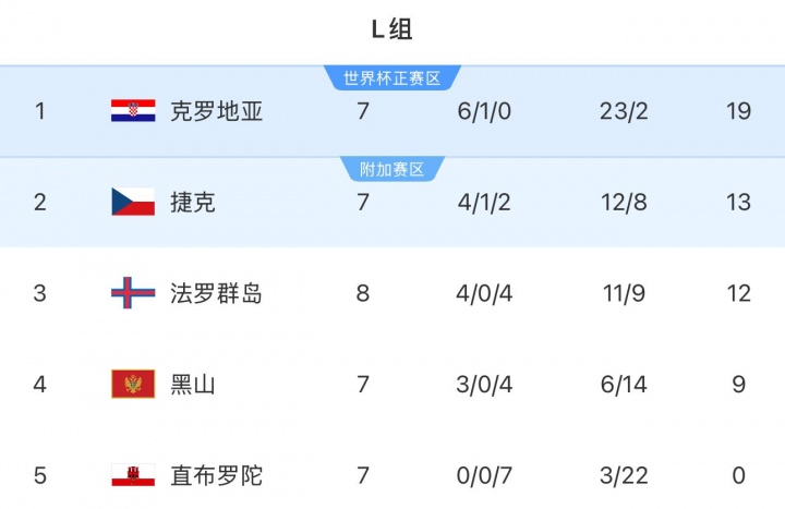 11月16日讯 世预赛欧洲区小组赛L组第9轮,法罗群岛1-3客负克罗地亚,8场小组赛结束后已确定无法进入前二,无缘2026美加墨世界杯赛 。