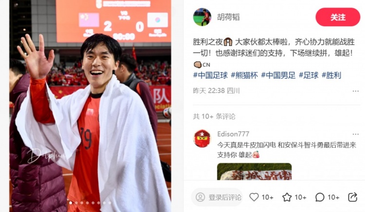在个人社媒,胡荷韬写道:获胜 之夜🙌🏼大家伙都太棒啦,齐心协力就能战胜一切!也感谢球迷们的支持,24直播网下场继续拼,雄起!👊🏼🇨🇳