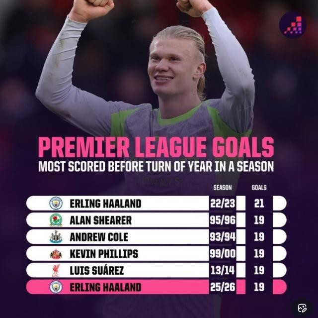 12月31日讯 2025年英超战罢,数据网站OPTA也盘点了英超历史在新年之前射手榜,其中本赛季哈兰德19球并列次席,记录 也由自己保持。